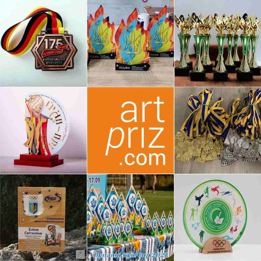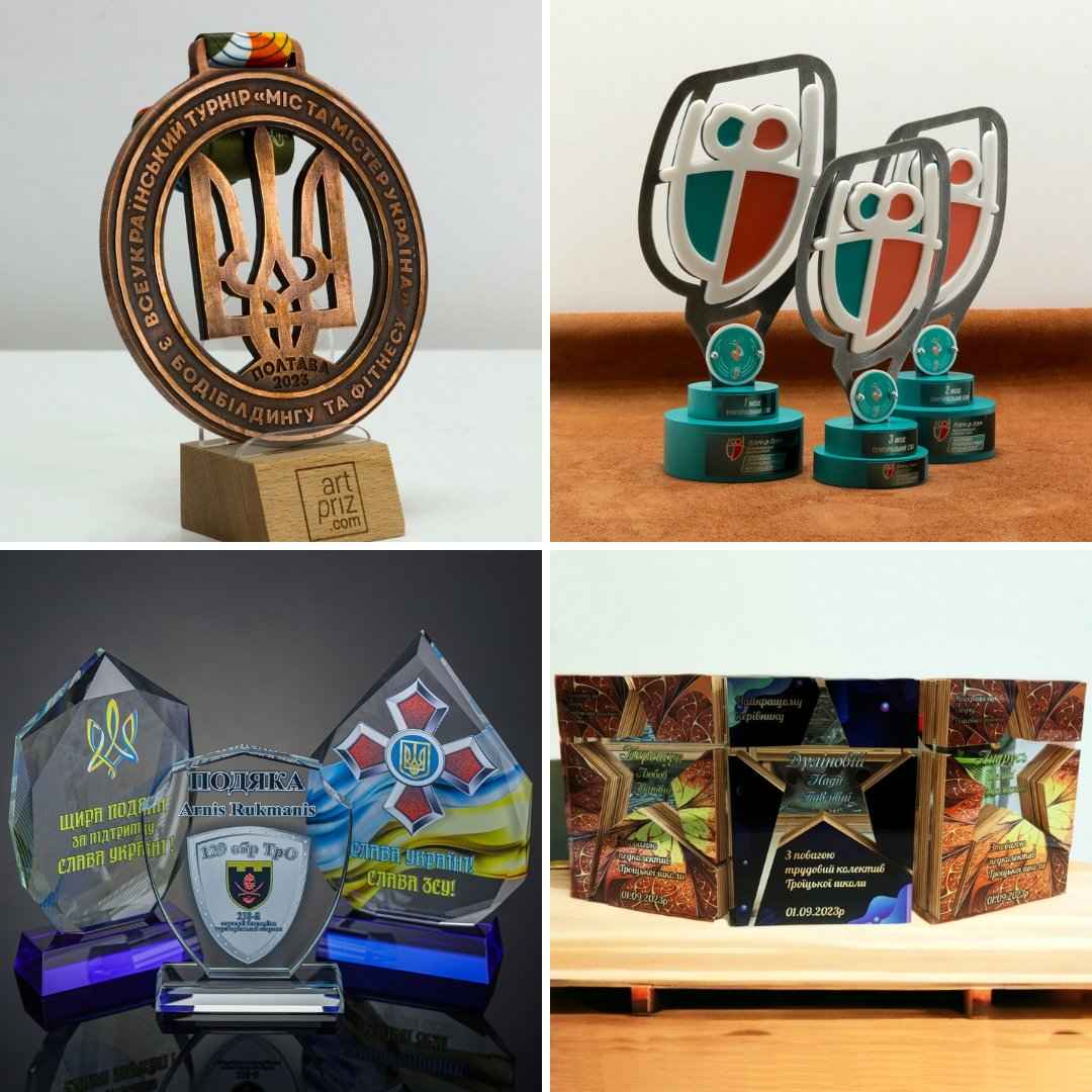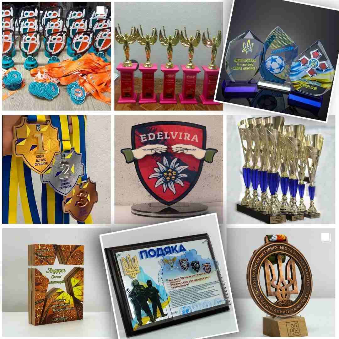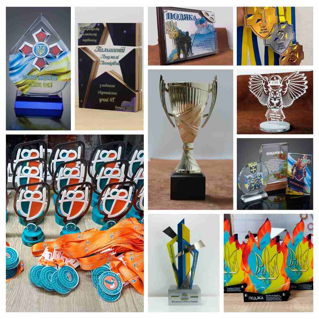 Медалі нагородні, різних розмірів, з металу, дерева, скла, акрилу. Стандартні та індивідуальні. Останні можна замовити практично за ціною стандартних, але таких нагород не буде більше ні в кого. До них можна замовити індивідуальну стрічку для медалей будь-яких кольорів з будь-яким малюнком.